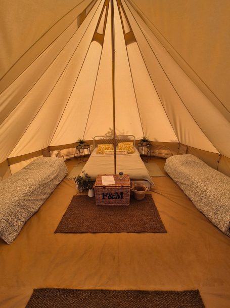 Our exclusive glamping experience is a true retreat. With just one bell tent, sleeping four, you'll enjoy complete privacy and peace in your own field, nestled beside the sheep. Fully equipped with a shower, toilet, and kitchen area, its an exclusive escape.